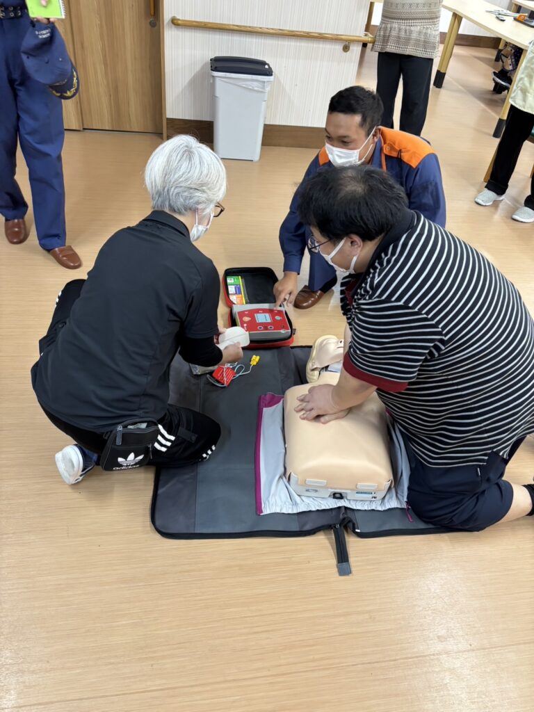1時間という講習は実践がメインで、心肺蘇生法やAED(自動体外式除細動器)の使用法を学びました。