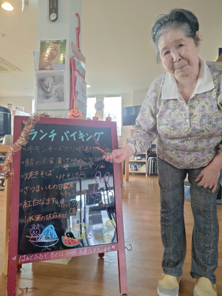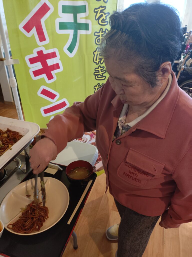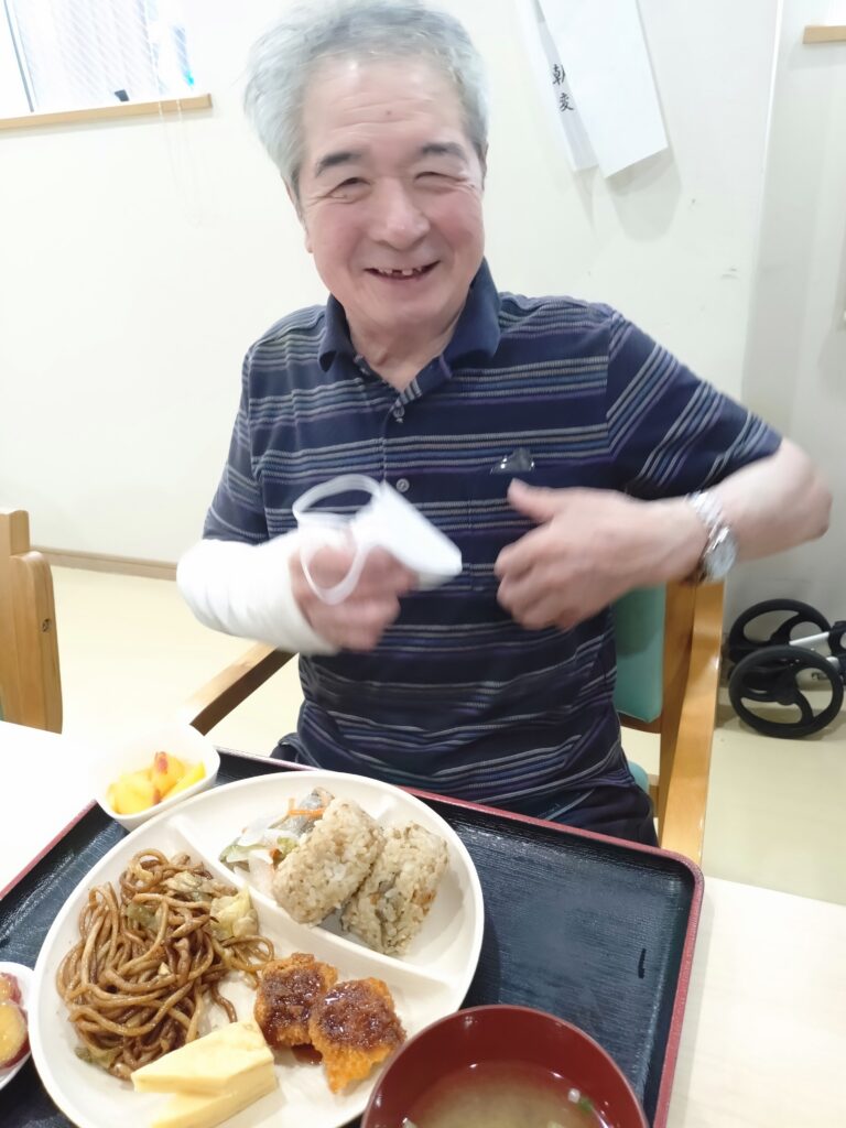 きのこご飯のおにぎり🍙を召し上がられている入居者様は今回が初めてのバイキングでしたが