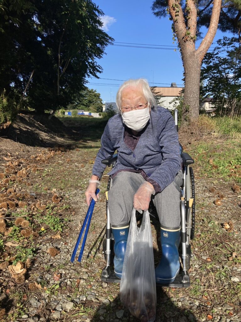 こちら、はぁとふるの最高齢のI様、本日は立候補し栗拾いへ参加されていました(⌒∇⌒)