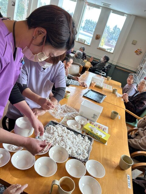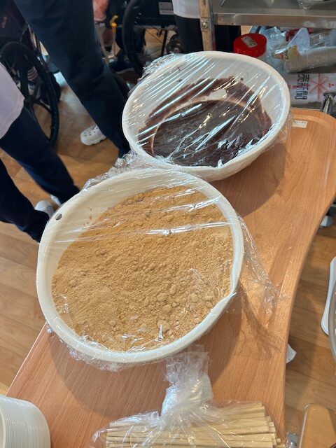 あんこ・きなこ・砂糖醤油から好きな物を選んでもらい、職員がお皿に盛り付けました✨